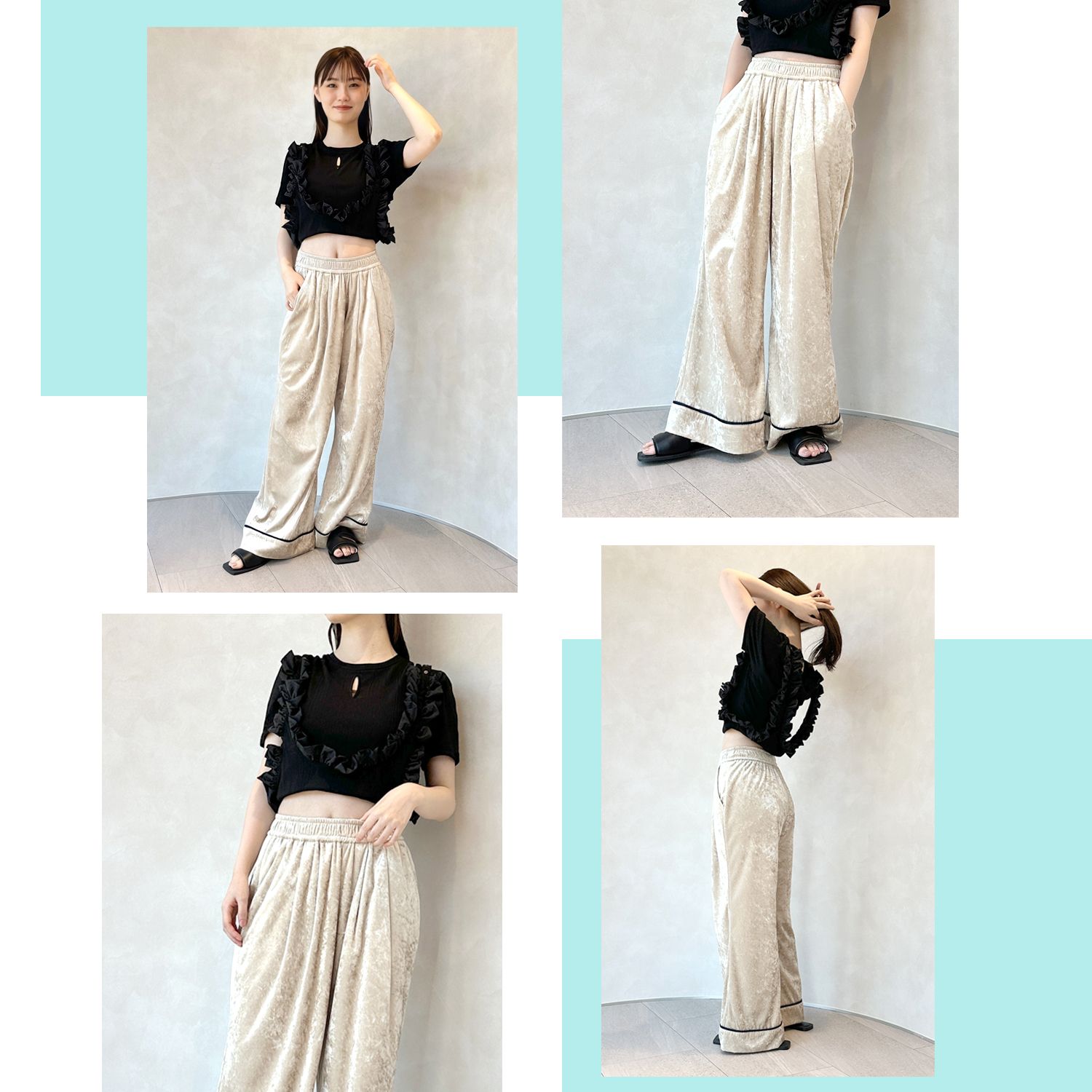 " “光の当たり方で表情が変わる”クラッシュベロア。バイカラーパイピングとウエスト紐が効いた、大人のリラックスパンツ。 "