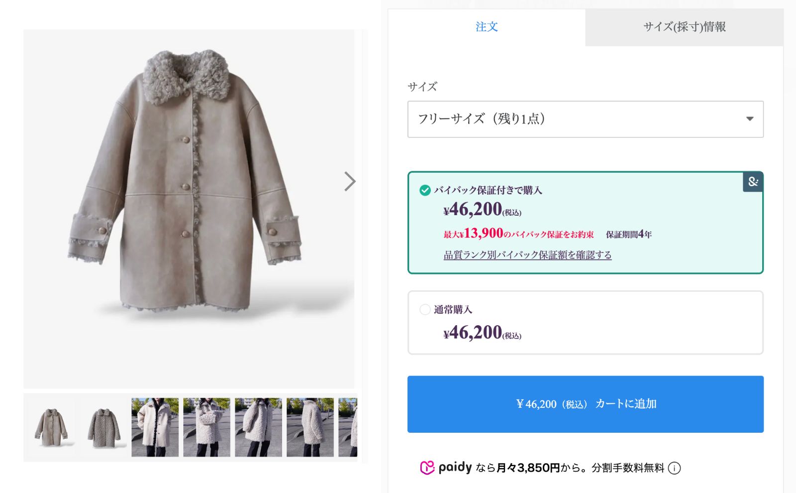 サイズ展開のある商品は購入サイズを選択すると、保証金額が表示されます。