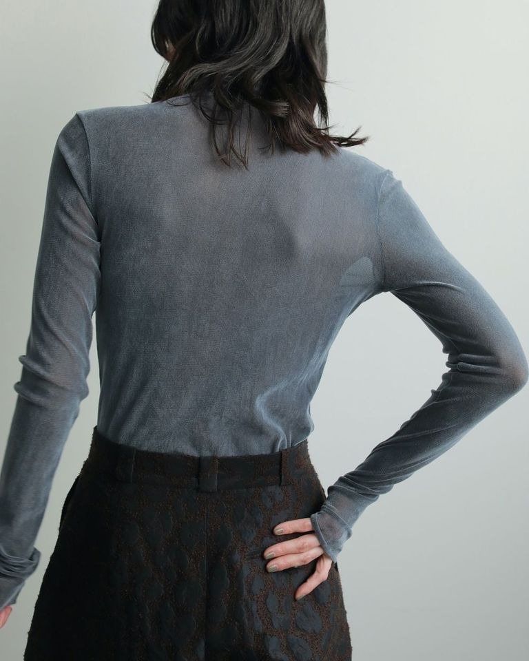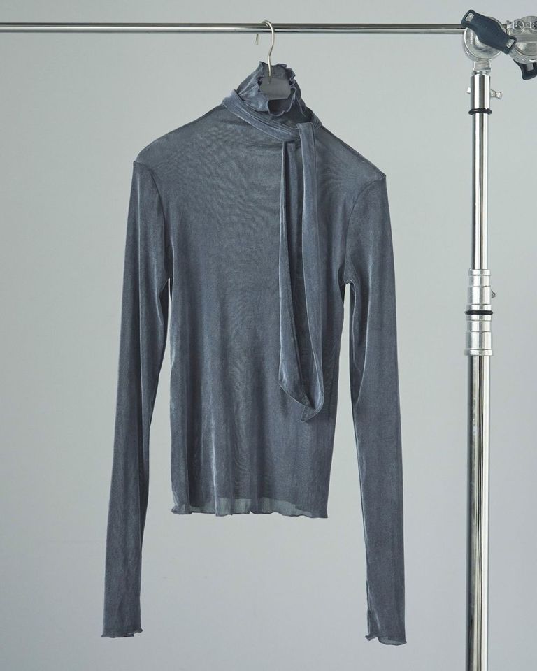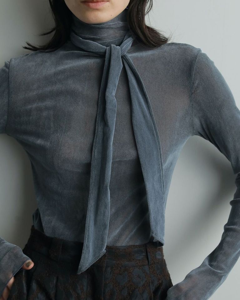 ストレッチチュールのベロアに細いタイをひと結び。首まわりだけで“きれいめモード”に切り替わるタートルトップス。