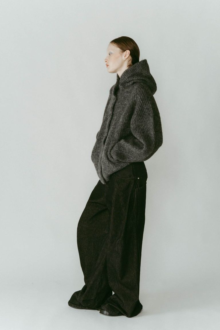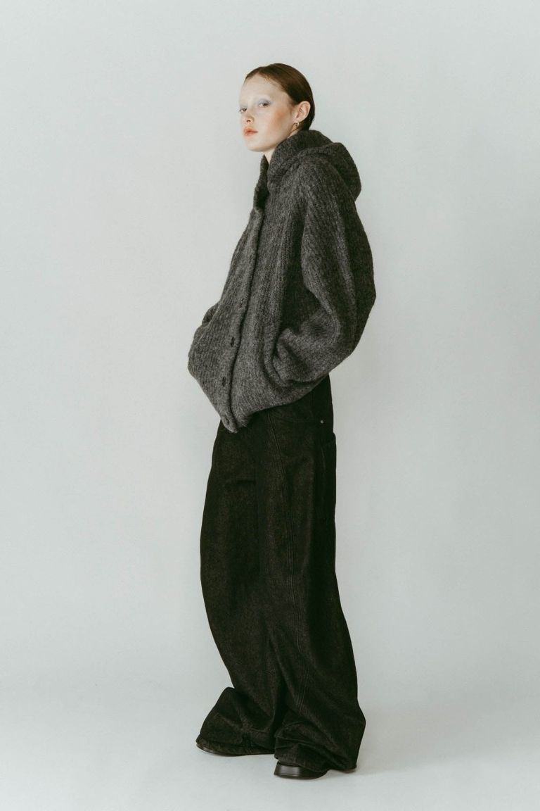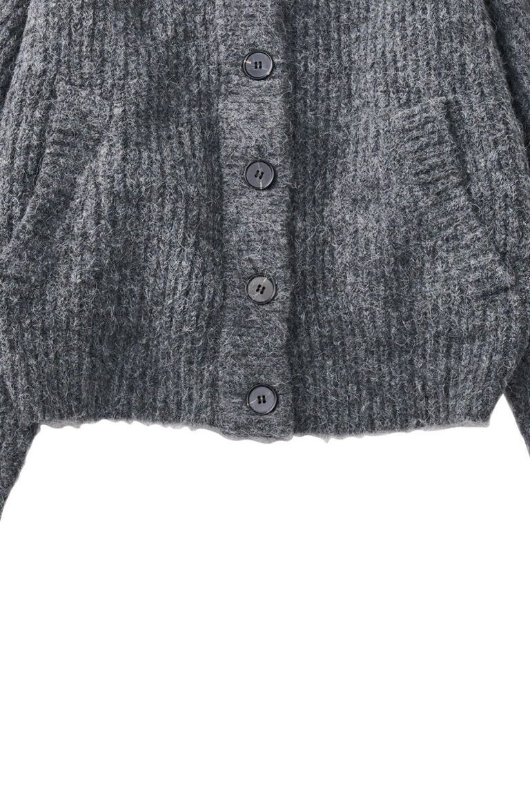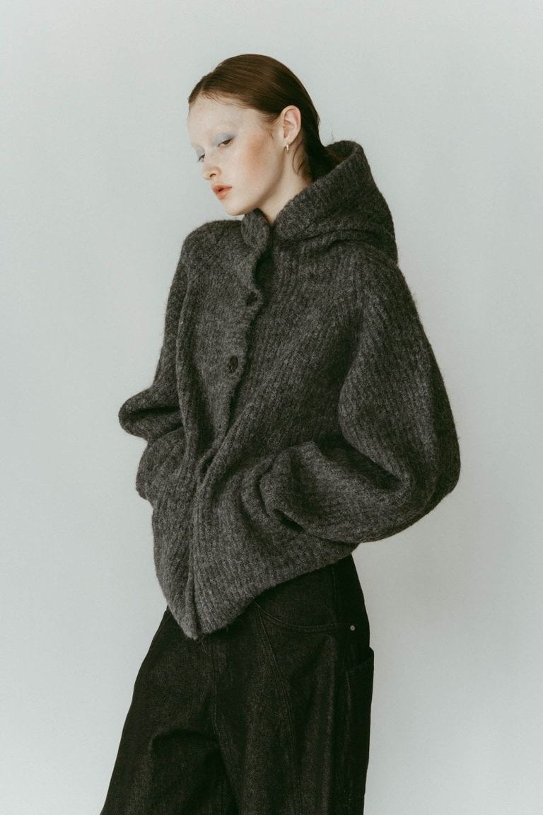 ふっくらとした編み地が印象的なフード付きカーディガンニット。